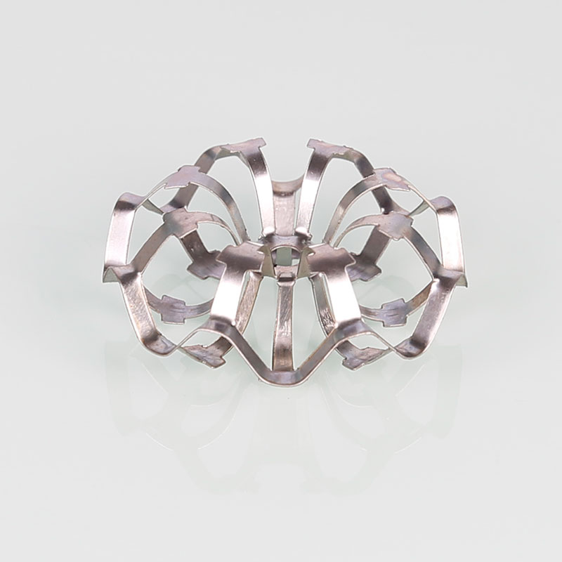 泰勒花環(huán)填料是由美國(guó)Teller.A.j.1954年介紹的一種填料,國(guó)內(nèi)通稱泰勒花環(huán)。它是由許多圓環(huán)繞結(jié)而成,現(xiàn)已成為系列化產(chǎn)品,共有三個(gè)型號(hào)。這種填料的主要特點(diǎn)是填料的空隙率大,不易被堵塞,還有通量大、阻力小等優(yōu)點(diǎn),由于這種填料的間隙處能有較高的滯液量,可使塔內(nèi)液體停留時(shí)間較長(zhǎng),從而增加了氣液的接觸時(shí)間,提高了優(yōu)質(zhì)效率。